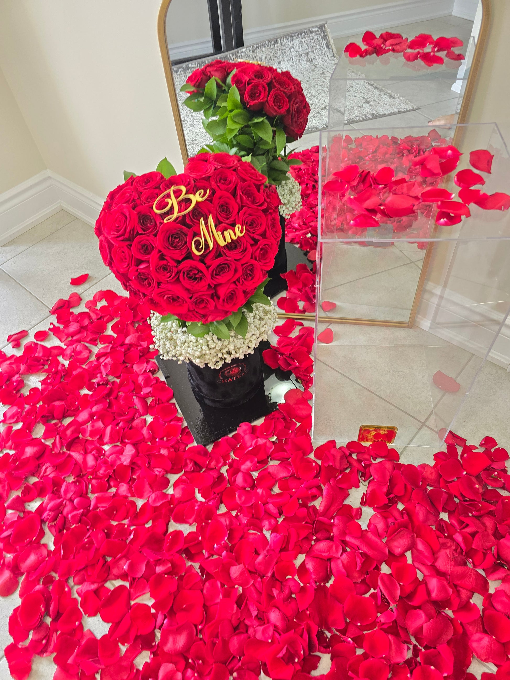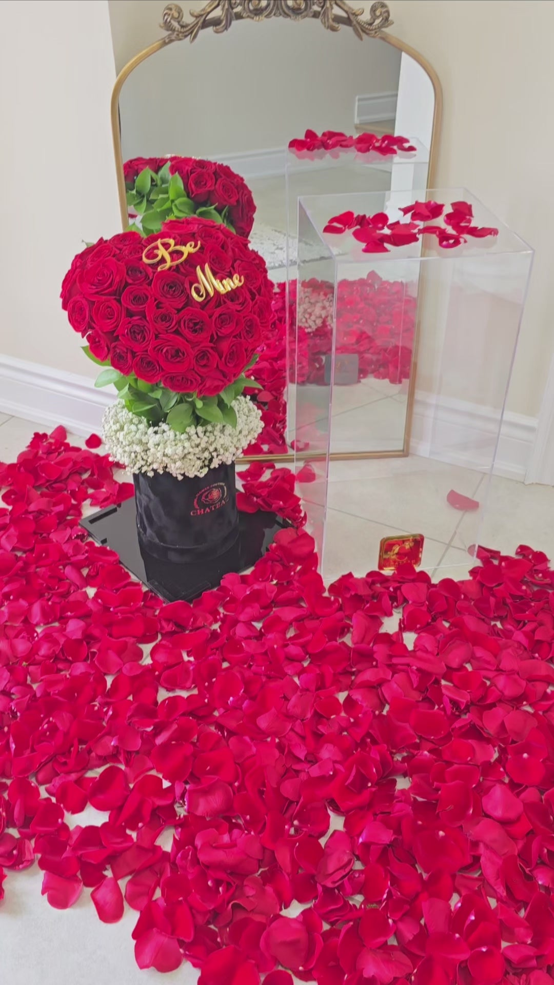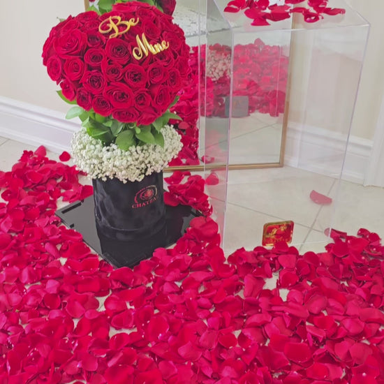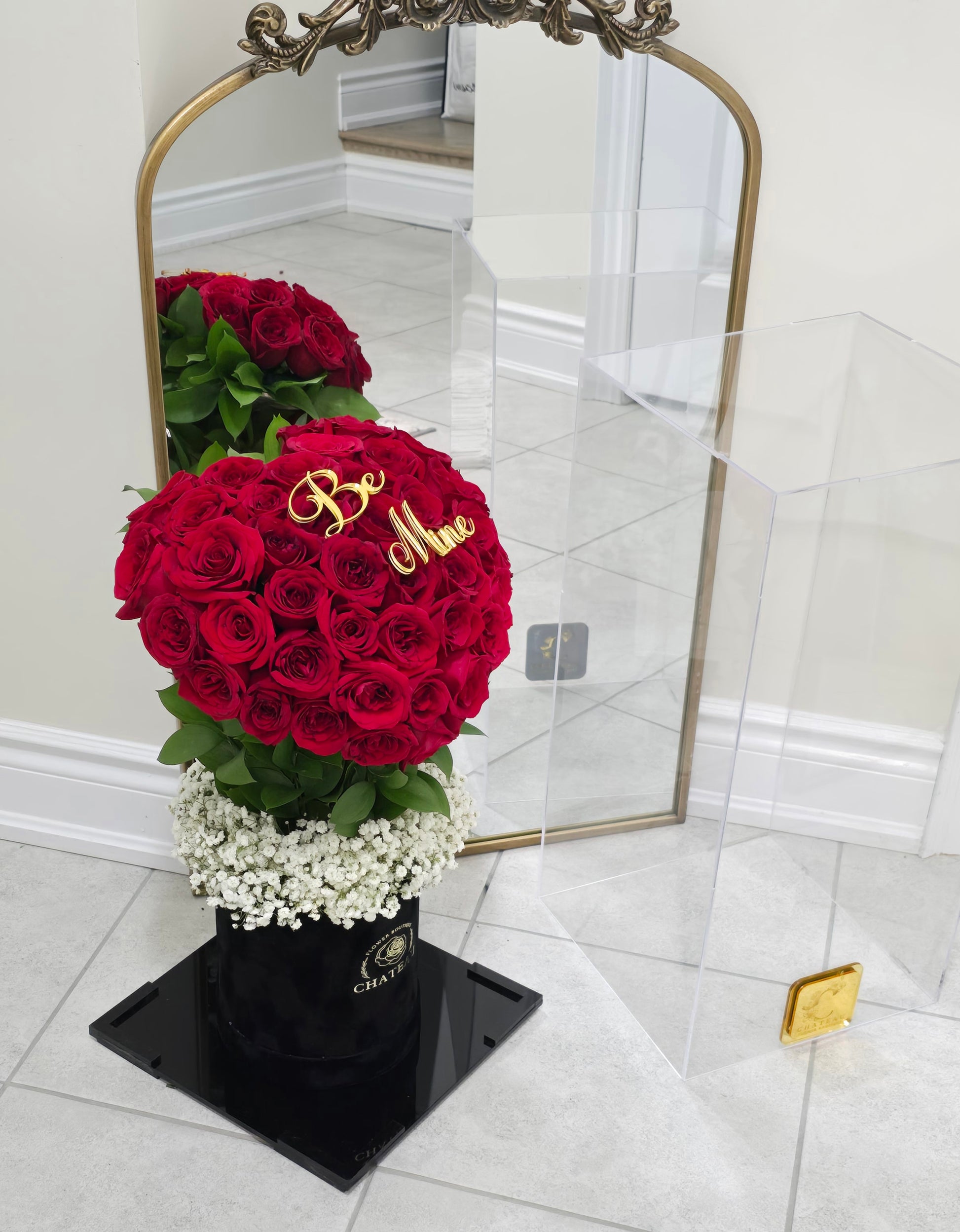 Chateau Velvet round box measured with 45 stems of premium Ecuadorian roses, fresh gypsophila & greenery. Gold Acrylic Signs included.