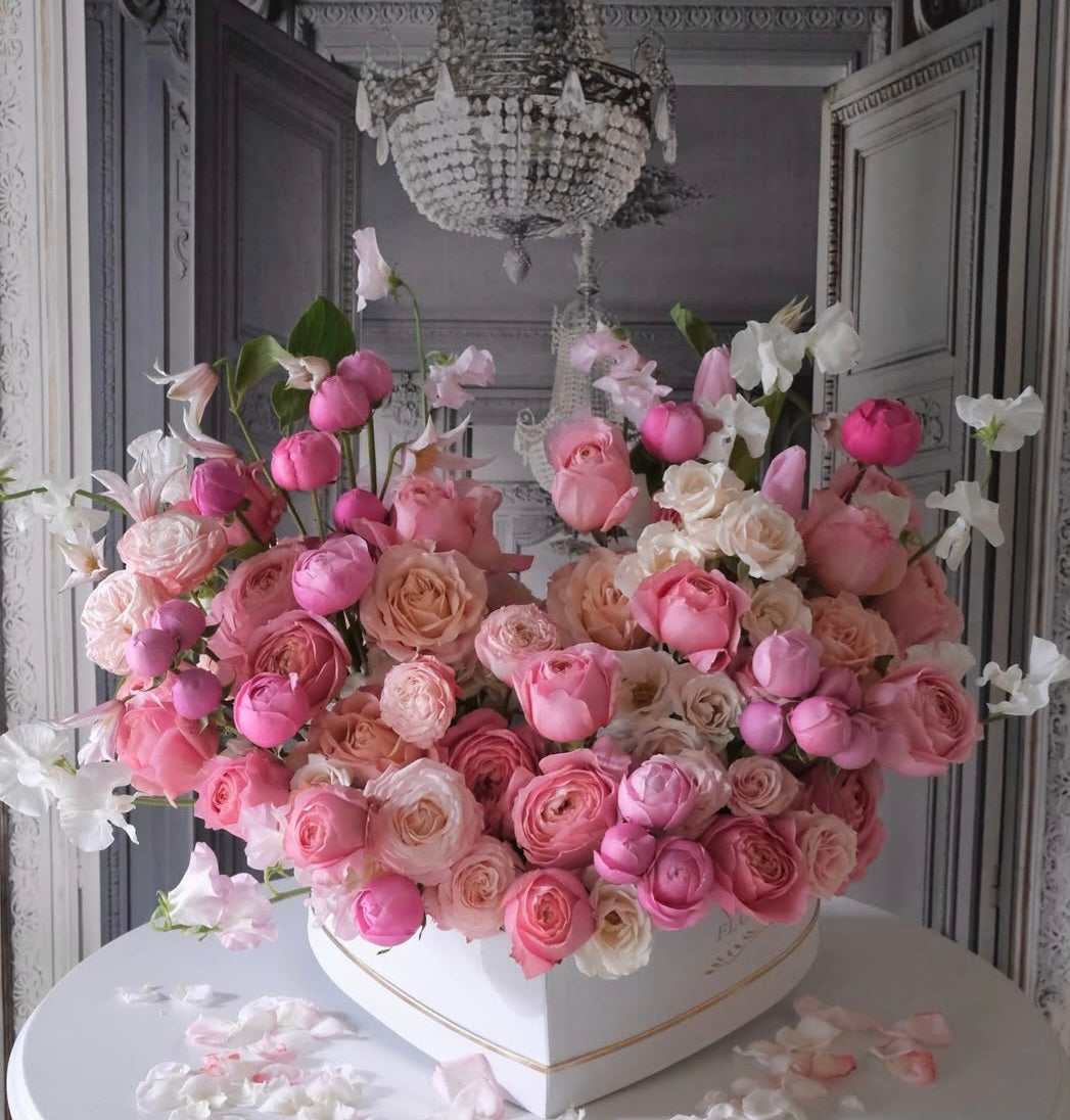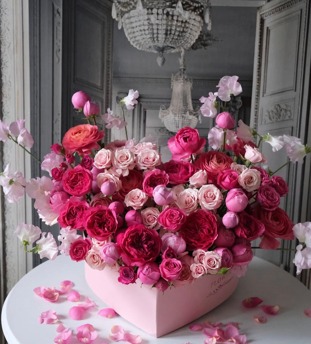 Experience the luxury of fresh flowers with our Roses & Ranunculus , Peony, Spray Roses, Sweet Pea Heart Shaped Mix Flower Bouquet In A Box. This exquisite arrangement features a stunning combination of pink, peach, and white ranunculus, complemented by elegant pink and peach roses, and fragrant stock flowers. The heart-shaped bouquet is beautifully adorned with pearl beads, adding a touch of sophistication and charm to this already gorgeous arrangement.