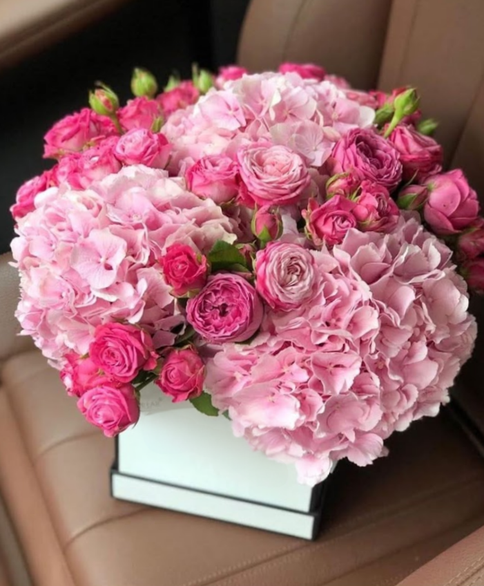 Pink hydrangeas with tea mini roses in an arrangement inspired by English tea ceremony.
