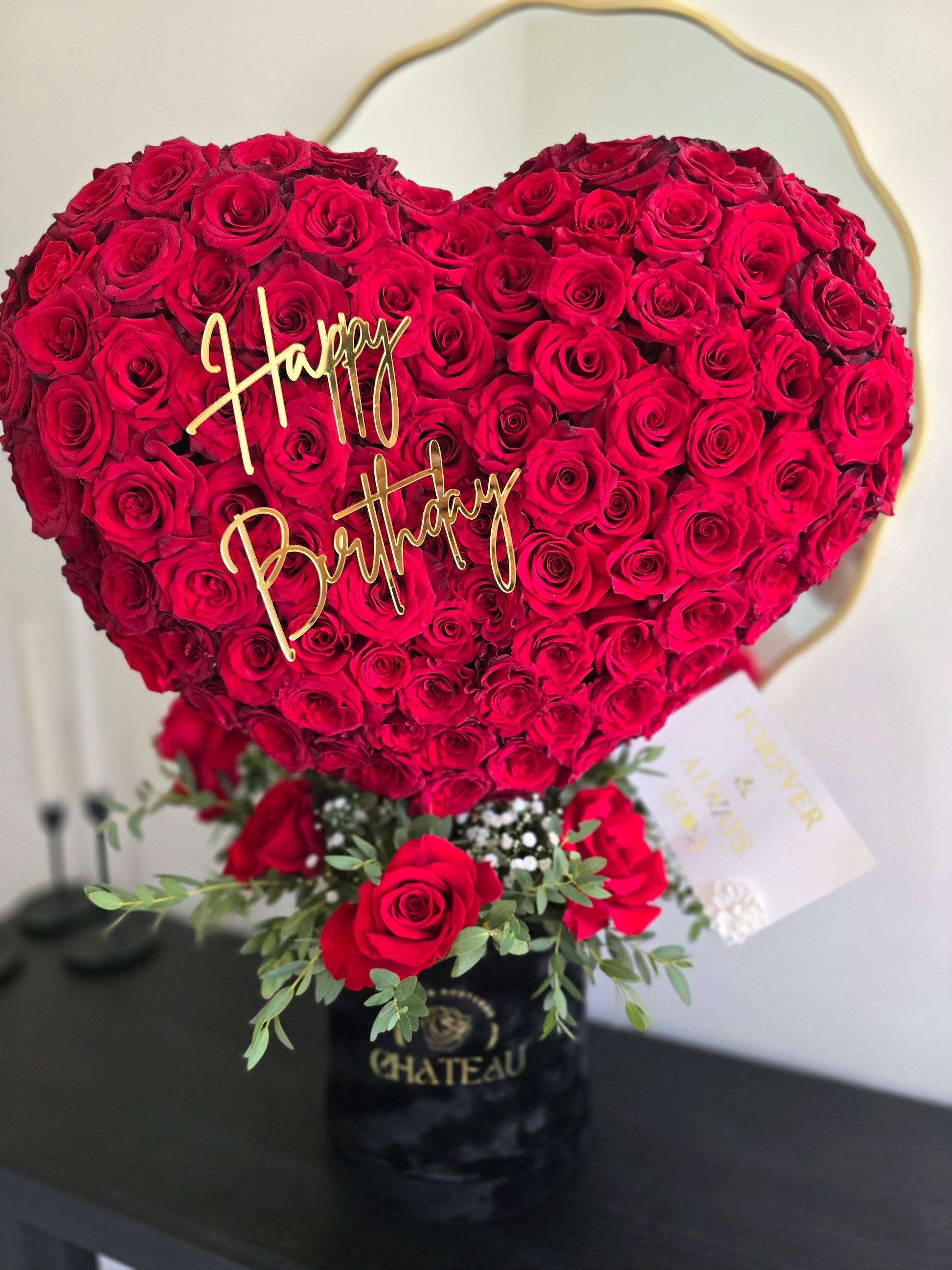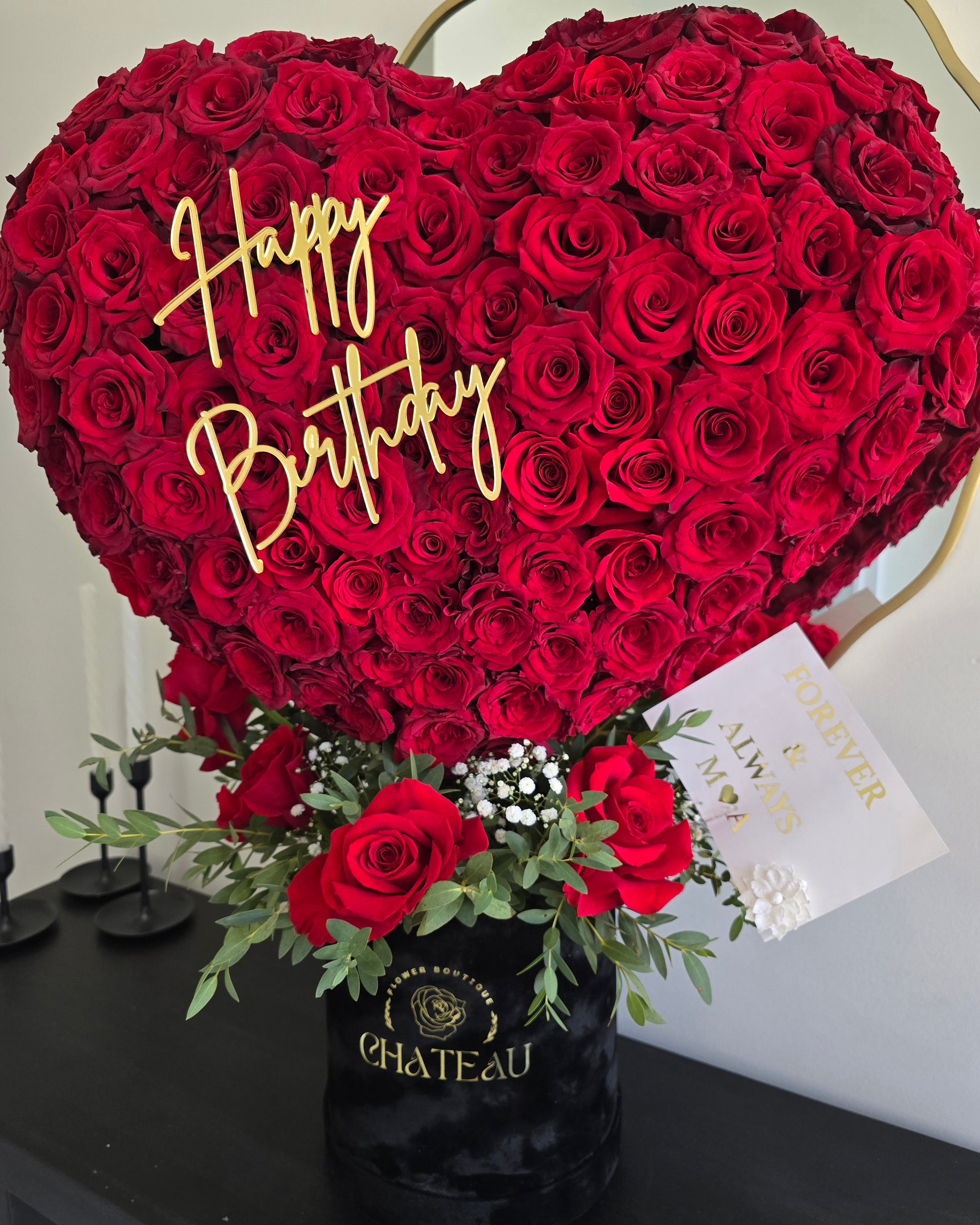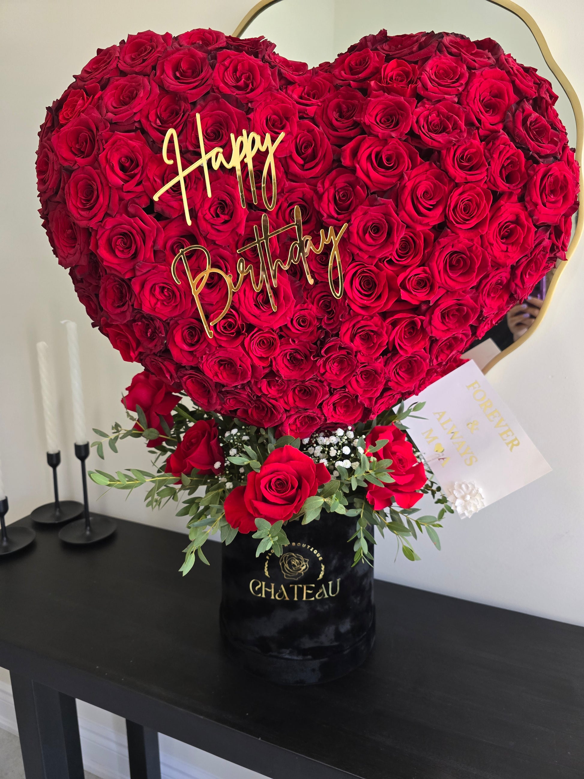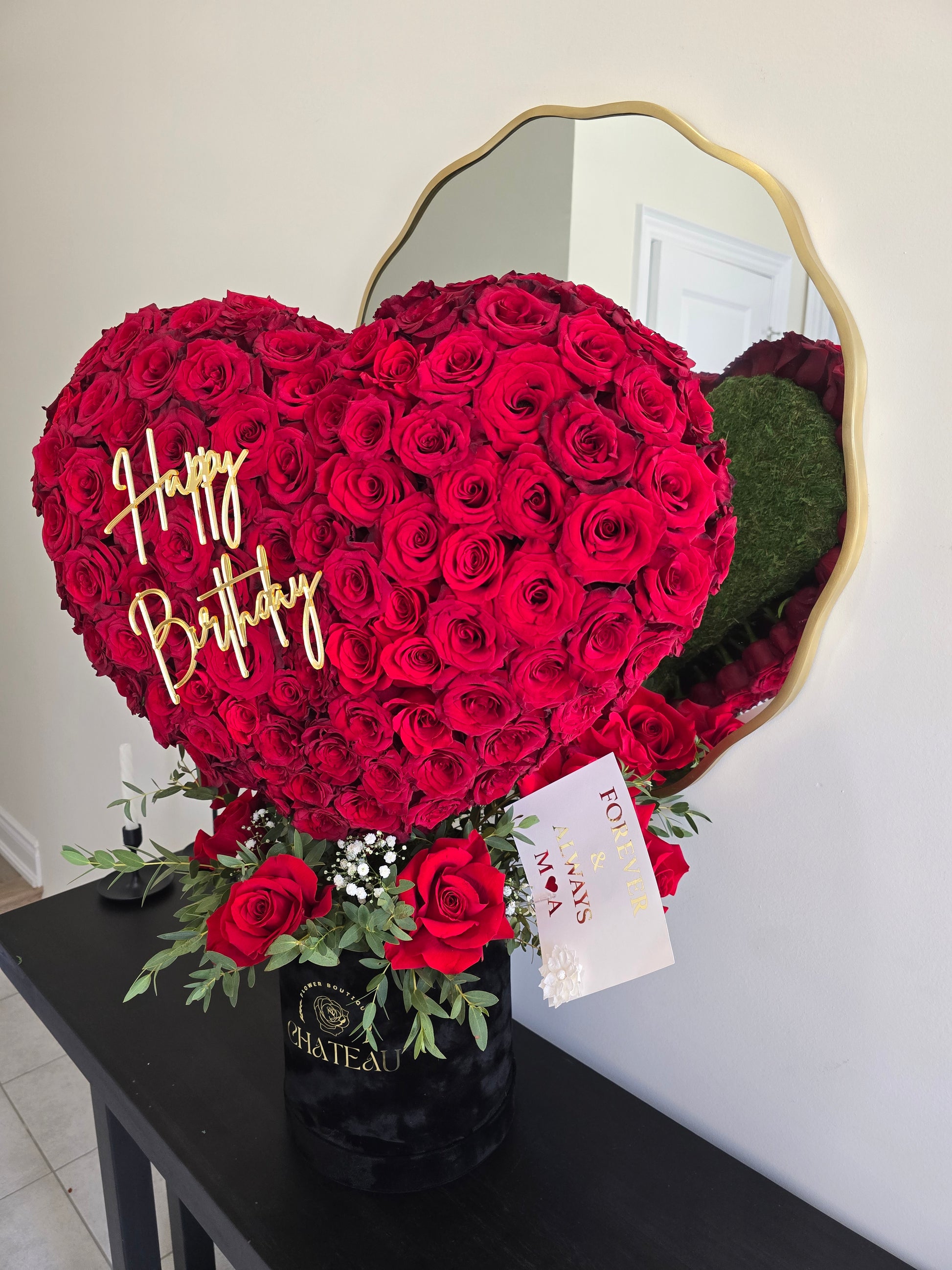 This luxurious heart-shaped sculpture is a jaw-dropping masterpiece that speaks volumes of love without uttering a word. With an extravagant touch, this standing heart makes a bold statement. Our design team has poured their hearts into every little detail to achieve perfection. It showcases FRESH premium red roses and elegant orchids, exuding elegance and sophistication.