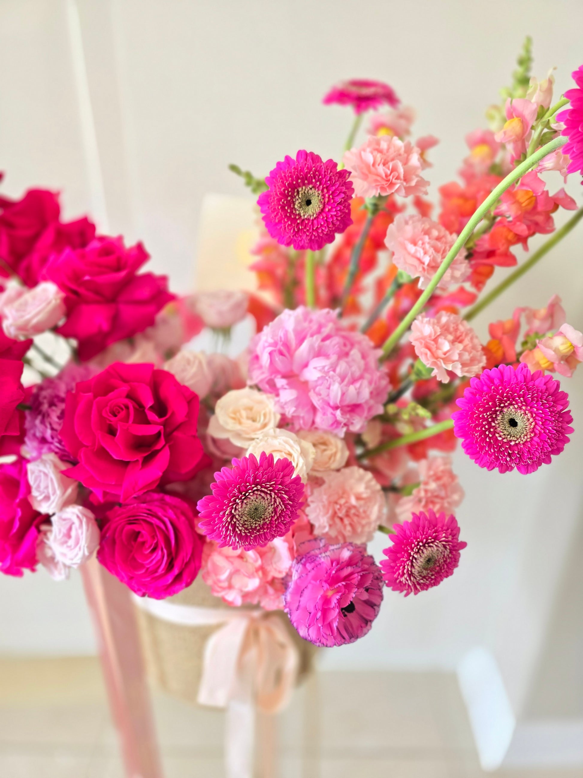 Experience the luxury of fresh flowers with our Roses & Ranunculus , Peony, Spray Roses, Sweet Pea Mix Flower Arrangement in a basket. This exquisite arrangement features a stunning combination of pink, peach and lavender ranunculus, complemented by elegant pink and peach roses, and fragrant stock flowers.