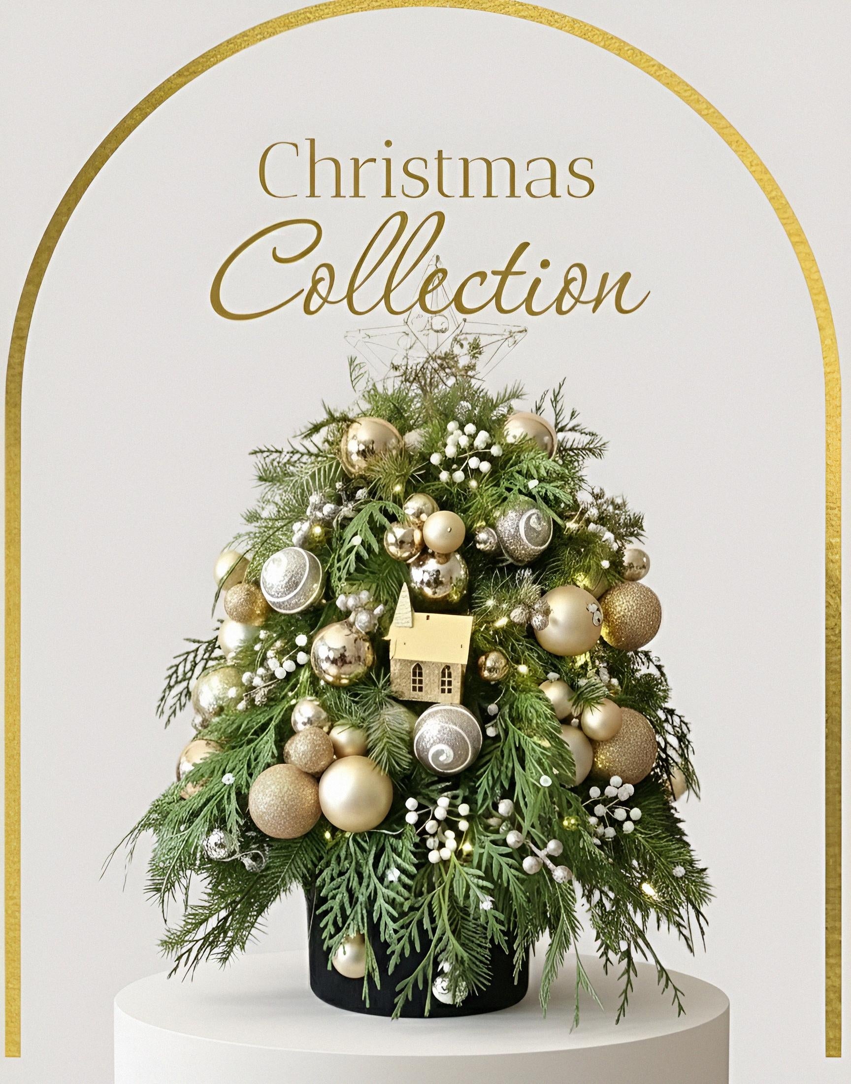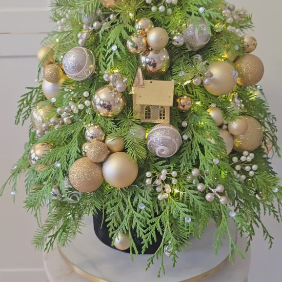 Introduce timeless holiday refinement with The Golden Homestead Mini Tree, an exquisitely designed seasonal piece from Chateau Flower Boutique. Composed of premium fresh evergreen boughs—fragrant spruce and fir with a delicate frosted patina—A refined miniature arrangement adorned with luxurious decorative spheres in Gold/Champagne or Gold/Silver finishes, complemented by festive ornaments and a striking gold star accent. Warm white LED copper lights create an elegant glow, perfect for adding understated holiday sophistication to any space.