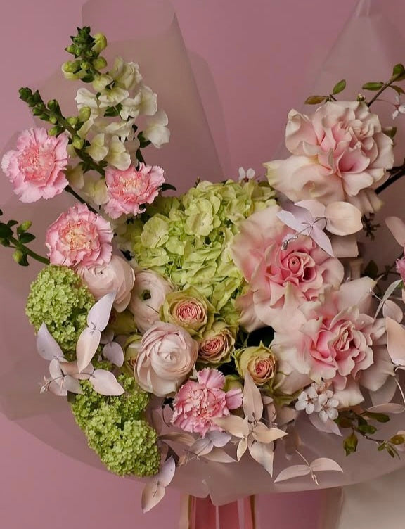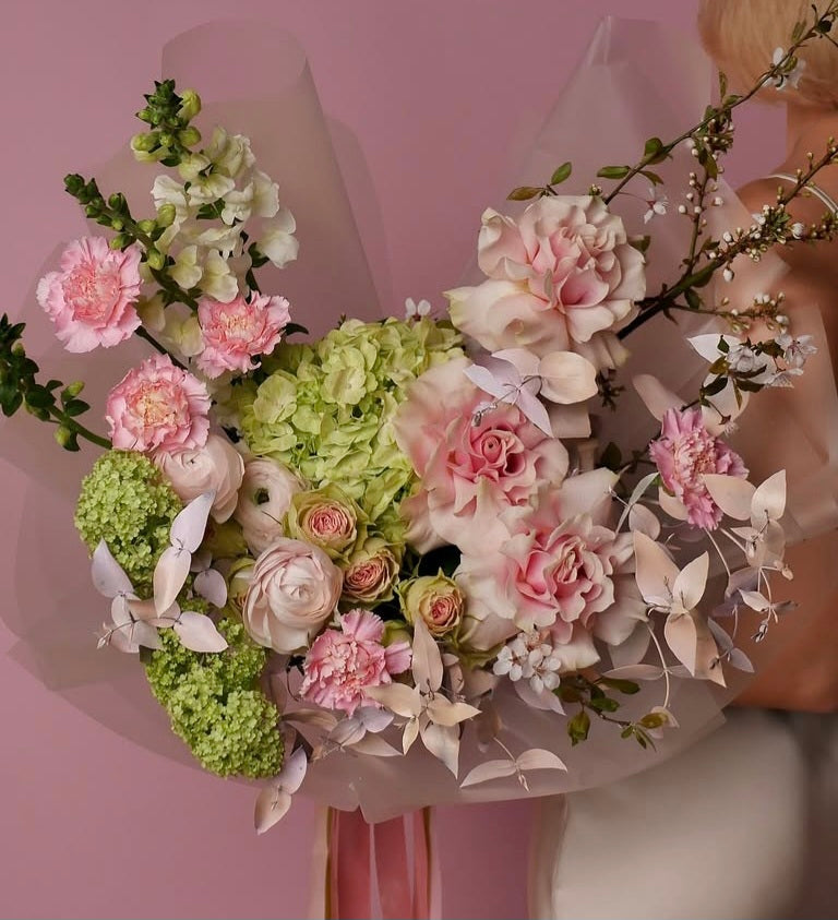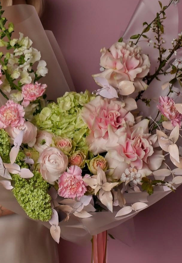 A lush bouquet is like a declaration of love, expressed without words. Ranunculus, roses and hydrangea with their lush, velvety buds give a feeling of warmth and tenderness, like a hug in which you want to stay forever. And lisianthus and ranunculus, with their graceful, almost transparent petals, add lightness and touching fragility to the bouquet, as if it were the very embodiment of sincerity.