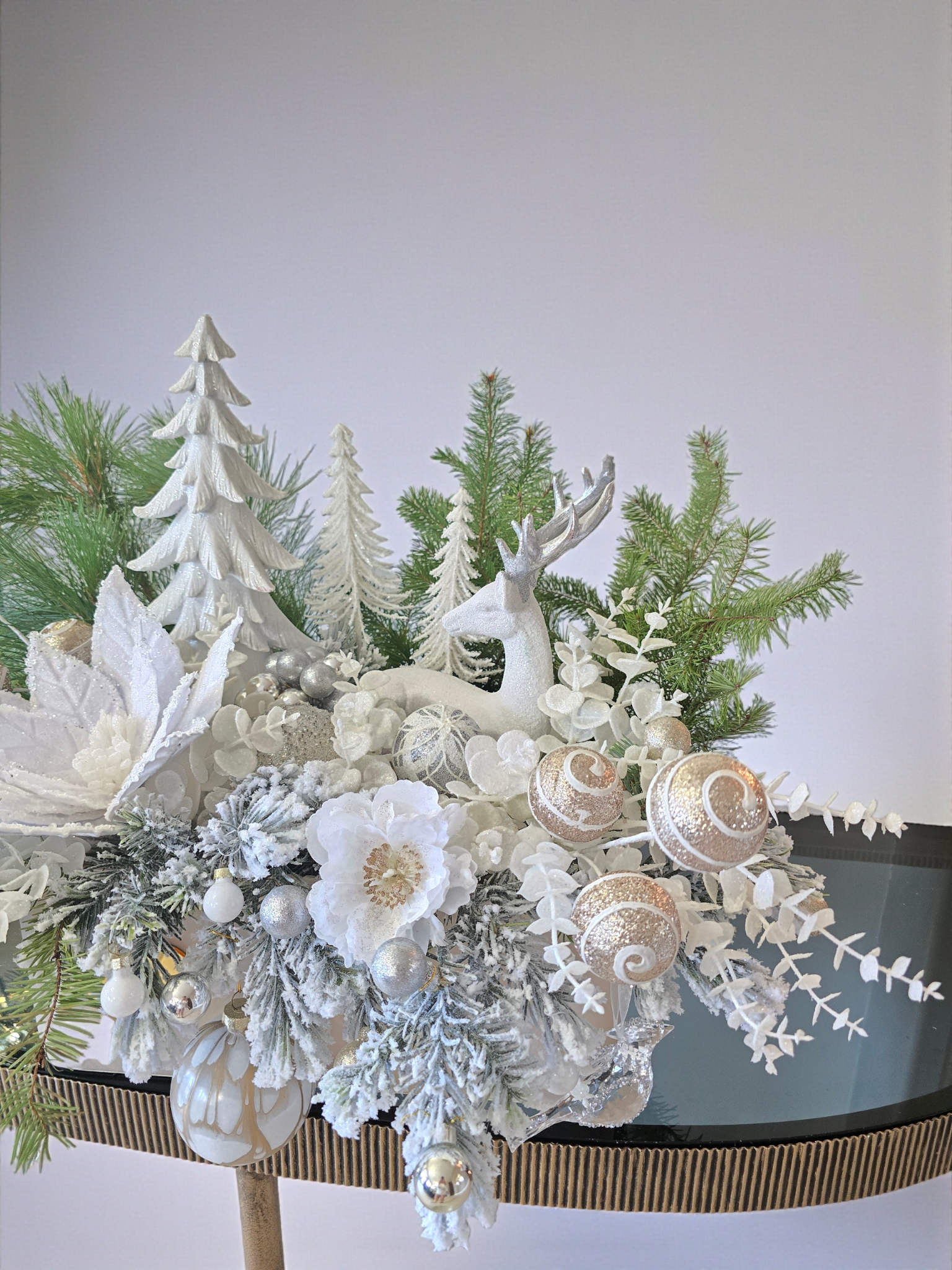 Merry & Bright" Long & Low White Wonderland Arrangement brings festive elegance to your holiday décor. This handcrafted centrepiece features a luxurious Snow White Tree & Reindeer paired with fresh, premium Norfolk Pine branches and thoughtfully handcrafted Christmas embellishments.